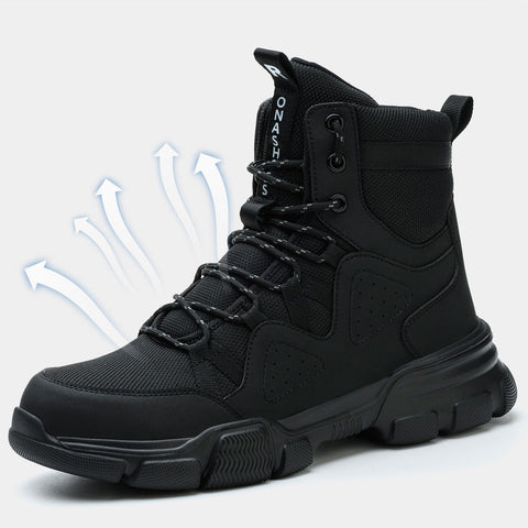 Safety work boots have received a modern update with a more comfortable fit. These are top quality and breathable safety boots that we have designed for all kinds of work environments and rugged, challenging open terrain. These work boots are not too heavy and are also designed to minimise the workload. With these safety boots you can work comfortably without your feet sweating.